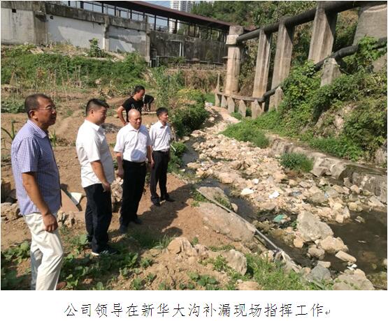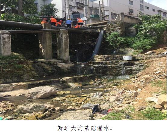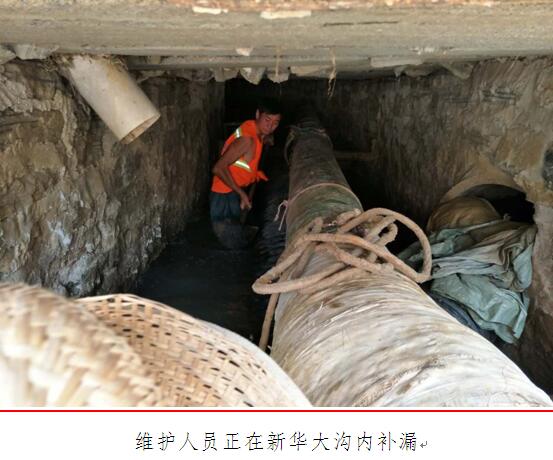 6·24洪灾后,新华大沟溢流井被洪水冲刷严重,底部多处漏水及堡坎垮塌,导致大量污水排入河中,污染河体。公司领导高度重视,顶着烈日赴现场指挥灾后重建工作。因新华大沟水量大且沟内水位深、漏点不明,补漏工作进展难度大,再加上进入七月以后,气温节节攀升,高温的气候影响到工作的进度,公司决定利用夜间污水量少的时候进行补漏。现已将大沟前部6米内的沉沙清理完成,大沟左右两壁及底部浇筑混凝土,堡坎已砌好。目前,正在进行施工后期的扫尾工作。