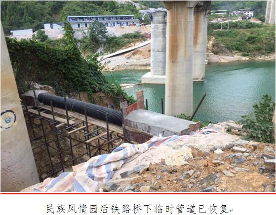 此外,我部正在对民族风情园后门段水毁的污水管道进行恢复。目前铁路桥下段水毁的污水管道已恢复,高架桥段水毁的污水管道正在搭建钢管架子。