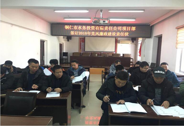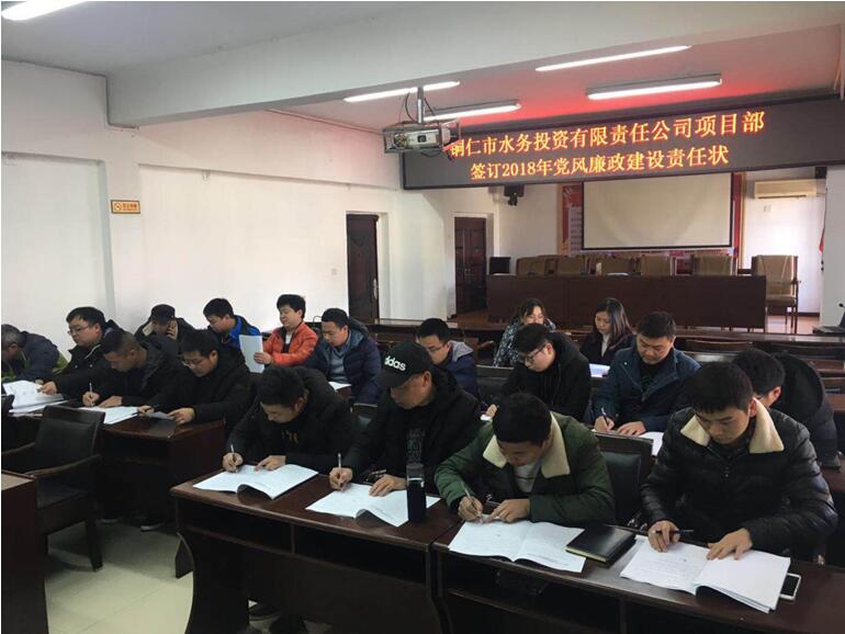为认真贯彻落实省、市、集团公司党委及各级纪委关于加强党风廉政建设责任制工作要求,进一步增强干部职工廉洁意识,全面推进本部门党风廉政建设和反腐败工作,2018年1月9日,按照公司党委要求,我部全体职工集体签订了《党风廉政责任状》、《综治和禁毒责任状》、《安全生产和消防安全责任状》和《2018年度铜仁市水务投资有限责任公司项目部拒收拒送礼金礼券购物卡承诺书》,要求全体职工认真履行“一岗双责”,对本部门的工作严格要求,严格管理,严格监督,切实加强责任心,搞好责任制的督促检查,严格责任追究制,确保责任制工作的落实,树立和弘扬优良作风,纠正损害群众利益的不正之风,努力打造一支务实、创新、廉洁、高效的干部职工队伍。