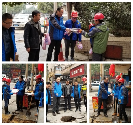 2018年2月2日上午,按照市城投集团公司党委的统一安排,集团公司党委委员、工会主席刘静一行在水投公司工会主席杜文及供水公司相关部门负责同志的陪同下,先后来到开发区台湾楼、碧江区老政协、东太建材市场等供水管网抢修点对一线职工进行走访慰问,每到一处,刘静主席分别与一线抢修人员亲切交谈,并为他们送去了慰问品,向他们道一声辛苦了!叮嘱他们在保障民生的同时要注意施工安全、自身安全,并提前向他们致以节日的问候,对他们不畏严寒坚守岗位,为千家万户用水默默付出的精神表示衷心的感谢!