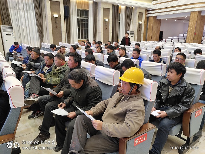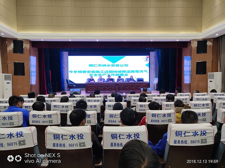 2018年12月13日晚7点30分,铜仁市供水安装公司组织全体职工及劳务工人开展今冬明春低温雨雪天气安全生产部署会暨安全生产培训会,传达学习《铜仁市水务局关于印发全市水务行业2018年今冬明春火灾防控工作方案的通知》《铜仁市水务局转发国务院安委会办公室关于进一步加强当前安全生产工作的紧急通知》等文件精神及要求。