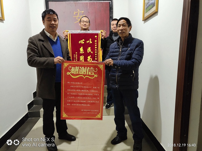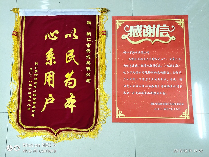 2018年12月19日,铜仁市供水安装公司收到一封来自铜仁学院经适房小区业委会送来的一封感谢信和一面题为“心系用户 以民为本”的锦旗,感谢信写道:“在贵公司的大力支持下和关心下,使我小区的供水改造工程得以顺利完成。工程的完成,使小区的供水问题得到彻底的解决,全体住户从此用上了清洁、卫生的自来水。为此,特向贵公司表示衷心的感谢!并祝愿贵公司在新的一年里取得更加辉煌的业绩。”