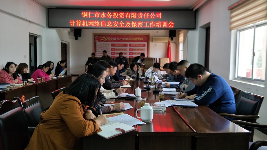 为贯彻落实中央、省、市对做好保密工作的系列部署要求,规范公司计算机及信息系统的使用和管理,提高网络信息安全和保密工作管理水平,2019年4月30日上午,市水投公司组织召开计算机网络信息安全及保密工作培训会。市水投公司党总支委员、副总经理黄宇舟主持会议,公司在家班子领导、各部门负责人、各公司班子成员、行政部、信息中心及从事保密、信息网络工作相关人员参加了会议。