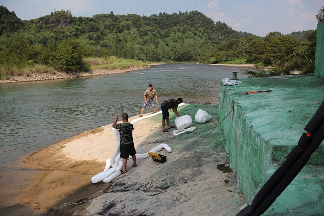 在更换拦油绳过程中,同志们顶烈日、冒酷暑,积极克服深水区作业复杂环境。经过连续数小时的工作,一条崭新的油污防线又重新漂浮在龙井取水口的周边,护卫着城市水源水质安全。