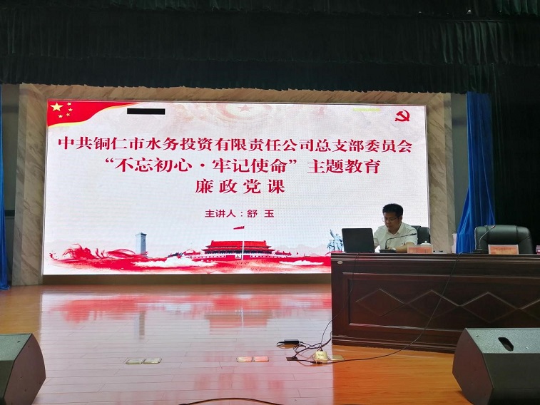 根据中央、省委、市委以及集团公司党委“不忘初心・牢记使命”主题教育相关会议精神。9月23日下午,市水投公司党总支在公司一楼大会议室召开“不忘初心・牢记使命”主题教育推进部署会暨廉政党课。市城投集团公司党委委员、副总经理、市水投公司董事长陈世新、市城投集团公司总工程师田毅出席会议,水投公司在家班子成员、全体党员、中层以上管理人员及党务工作人员近百人参会,会议由市水投公司党总支副书记杨冬生主持。市水投公司党总支书记舒玉同志上“不忘初心・牢记使命”主题教育廉政党课。