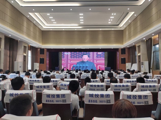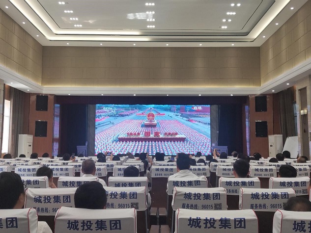 为庆祝中华人民共和国成立70周年,弘扬爱国主义精神,深入推进““不忘初心、牢记使命”主题教育。10月1日上午,市水投公司党总支组织开展庆祝中华人民共和国成立70周年暨深化““不忘初心、牢记使命”主题教育。市城投集团公司党委委员、副总经理、水投公司董事长陈世新,集团公司总工程师田毅出席活动,市水投公司、市供水总公司、市污水公司、市供水安装公司全体党员干部职工二百六十余人参加活动。