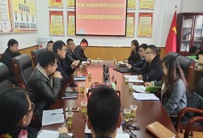 12月13日,市委组织部党支部标准化规范化复核验收组吴敏一行对水投公司机关党支部和供水公司党支部标准化规范化建设进行督导检查验收,市城投集团党委委员、副总经理、市水投公司党总支书记、董事长陈世新同志及各基层党支部书记和党务工作人员全程参加验收工作。