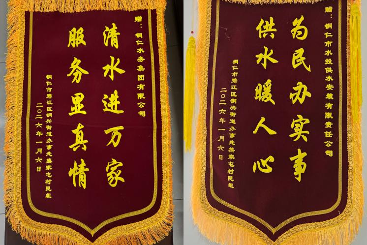 1月6日下午,春节即将来临之际,两面分别印着“清水进万家,服务显真情”“为民办实事,供水暖人心”的鲜红锦旗被铜兴街道办事处熊家屯村民组代表送到了水务公司大厅,字里行间饱含着对我司高效解决熊家屯村民组供水难题的诚挚谢意,也见证了一次以实干践行为民初心的暖心行动。